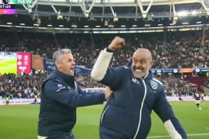 下半场补时第5分钟,绍切克补射破门帮助西汉姆锁定胜局,主帅努诺在场边与教练组激动相拥。